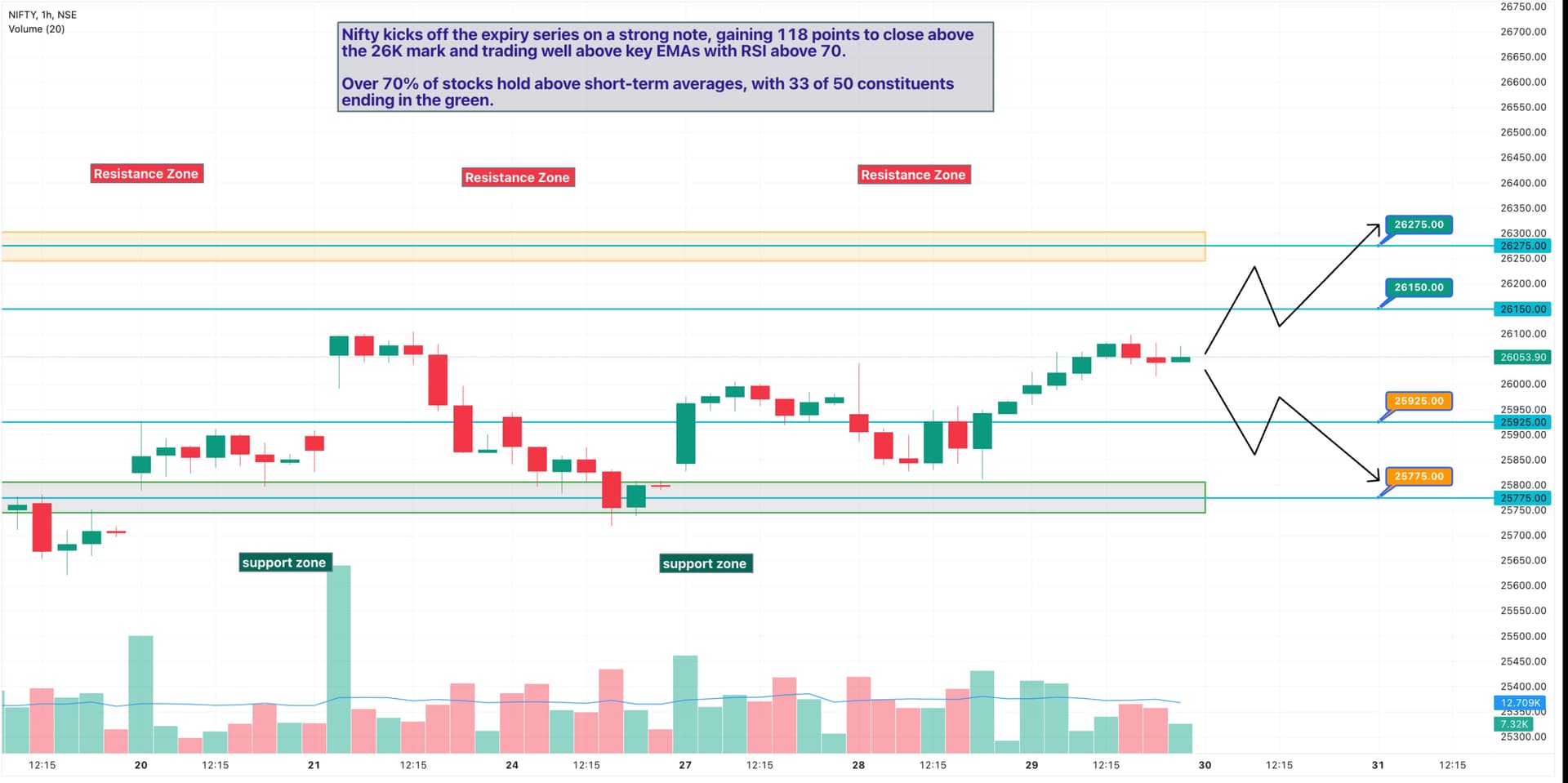 - Over 70% of Nifty stocks are trading above their 20 & 50 EMA levels, indicating underlying strength in the trend.