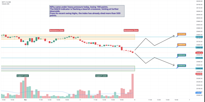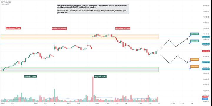- Nifty slipped below the 25,800 mark, losing 96 points amid pressure in FMCG and banking stocks.